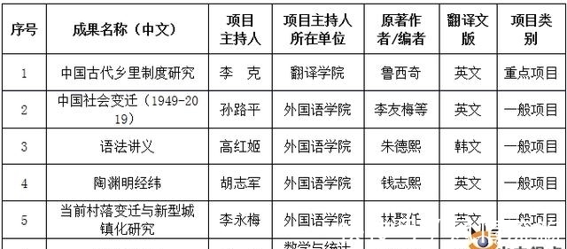 中华学术外译项目是国家社科基金项目的主要类别之一,主要资助代表中国学术水准、体现中华文化精髓、反映中国学术前沿的学术精品,以外文形式在国外权威出版机构出版并进入国外主流发行传播渠道,旨在发挥国家社科基金的示范引导作用,深化中外学术交流和对话,进一步扩大中国学术的国际影响力,提升国际学术话语权,让世界了解“哲学社会科学中的中国”。本年度中华学术外译项目共立项237项,立项数较多的高校有北京大学(8项)、南京大学(8项)、上海外国语大学(7项)、山东大学(6项)、同济大学(6项)、中国政法大学(6项)。(来源:山东大学)