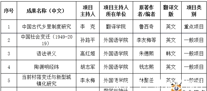 中华学术外译项目是国家社科基金项目的主要类别之一,主要资助代表中国学术水准、体现中华文化精髓、反映中国学术前沿的学术精品,以外文形式在国外权威出版机构出版并进入国外主流发行传播渠道,旨在发挥国家社科基金的示范引导作用,深化中外学术交流和对话,进一步扩大中国学术的国际影响力,提升国际学术话语权,让世界了解“哲学社会科学中的中国”。本年度中华学术外译项目共立项237项,立项数较多的高校有北京大学(8项)、南京大学(8项)、上海外国语大学(7项)、山东大学(6项)、同济大学(6项)、中国政法大学(6项)。